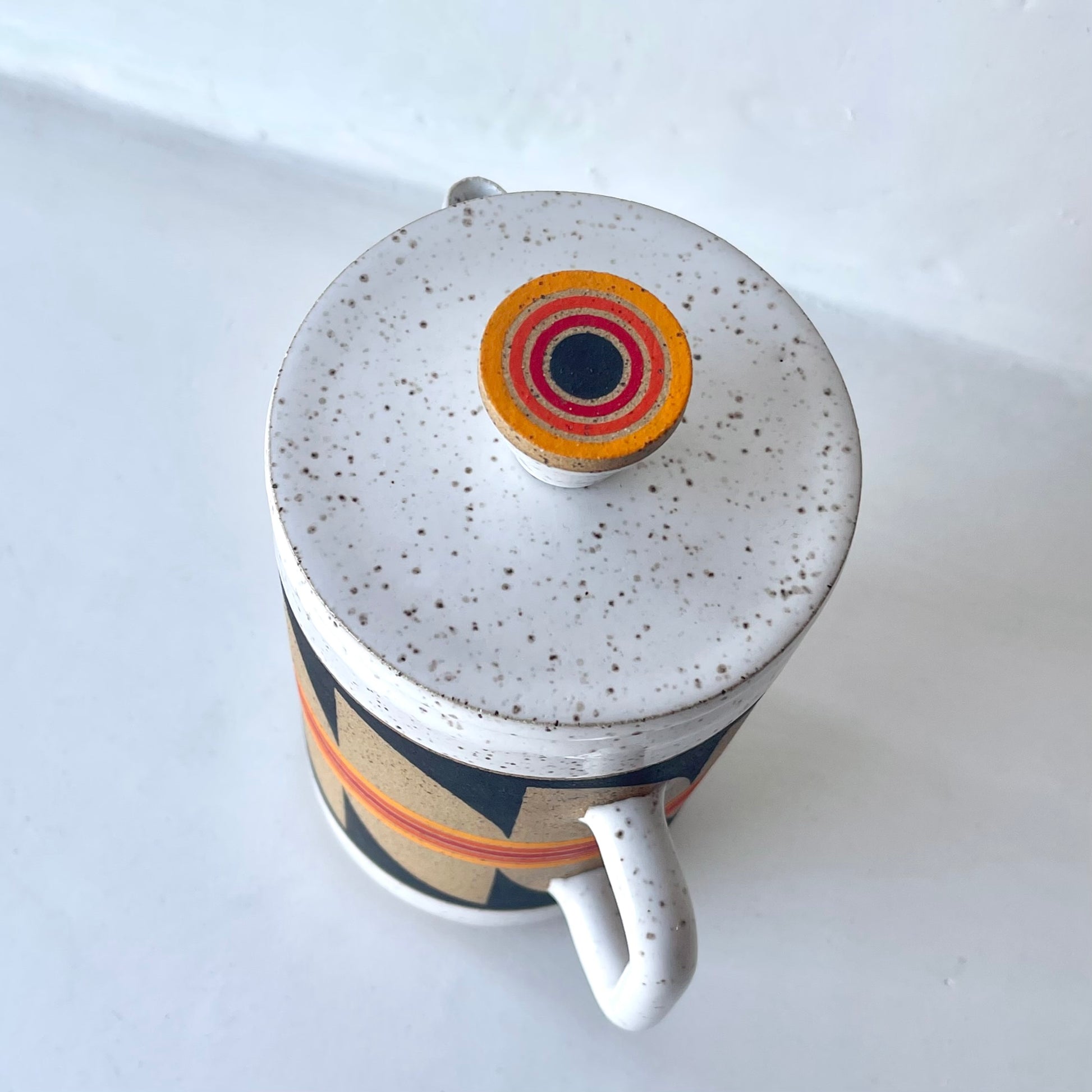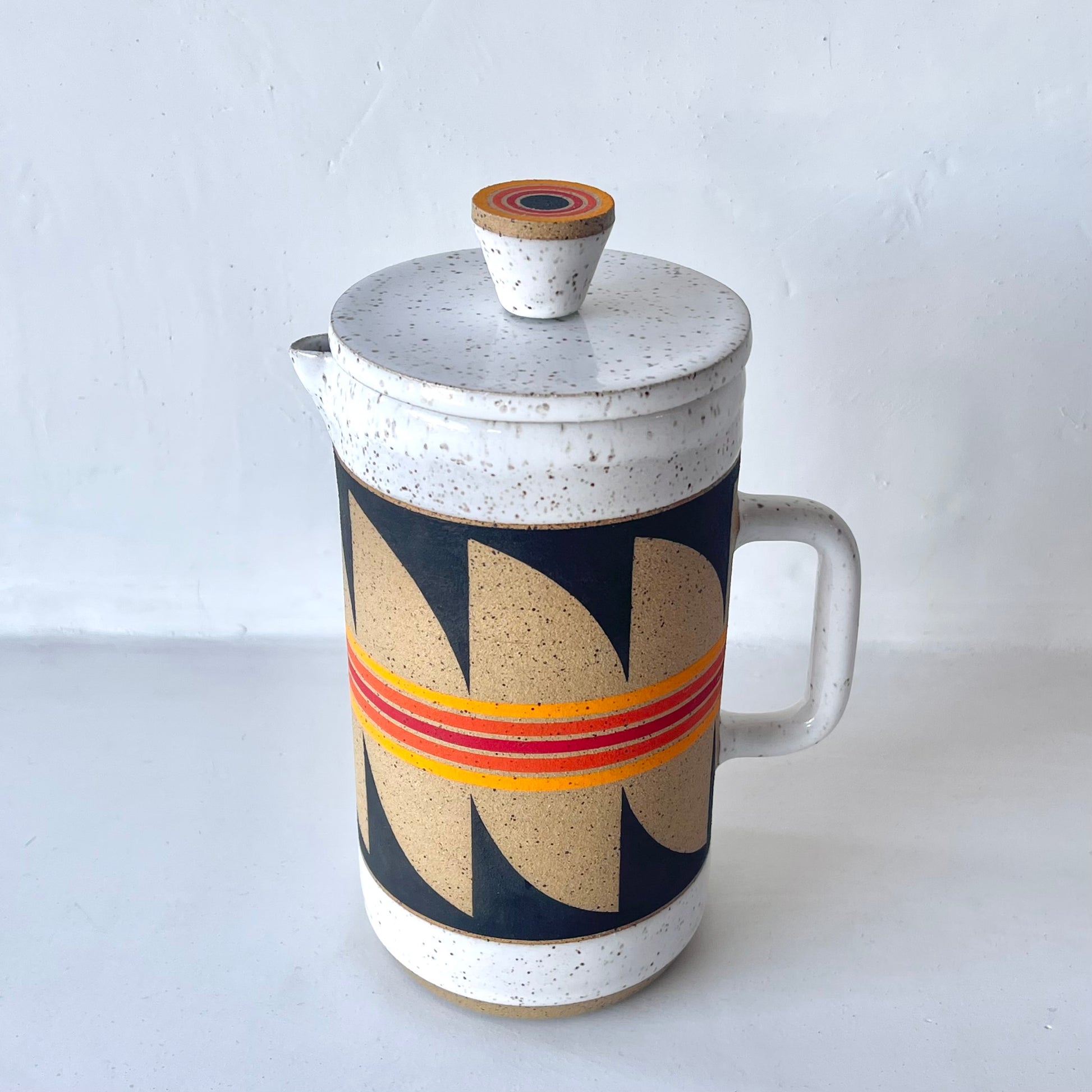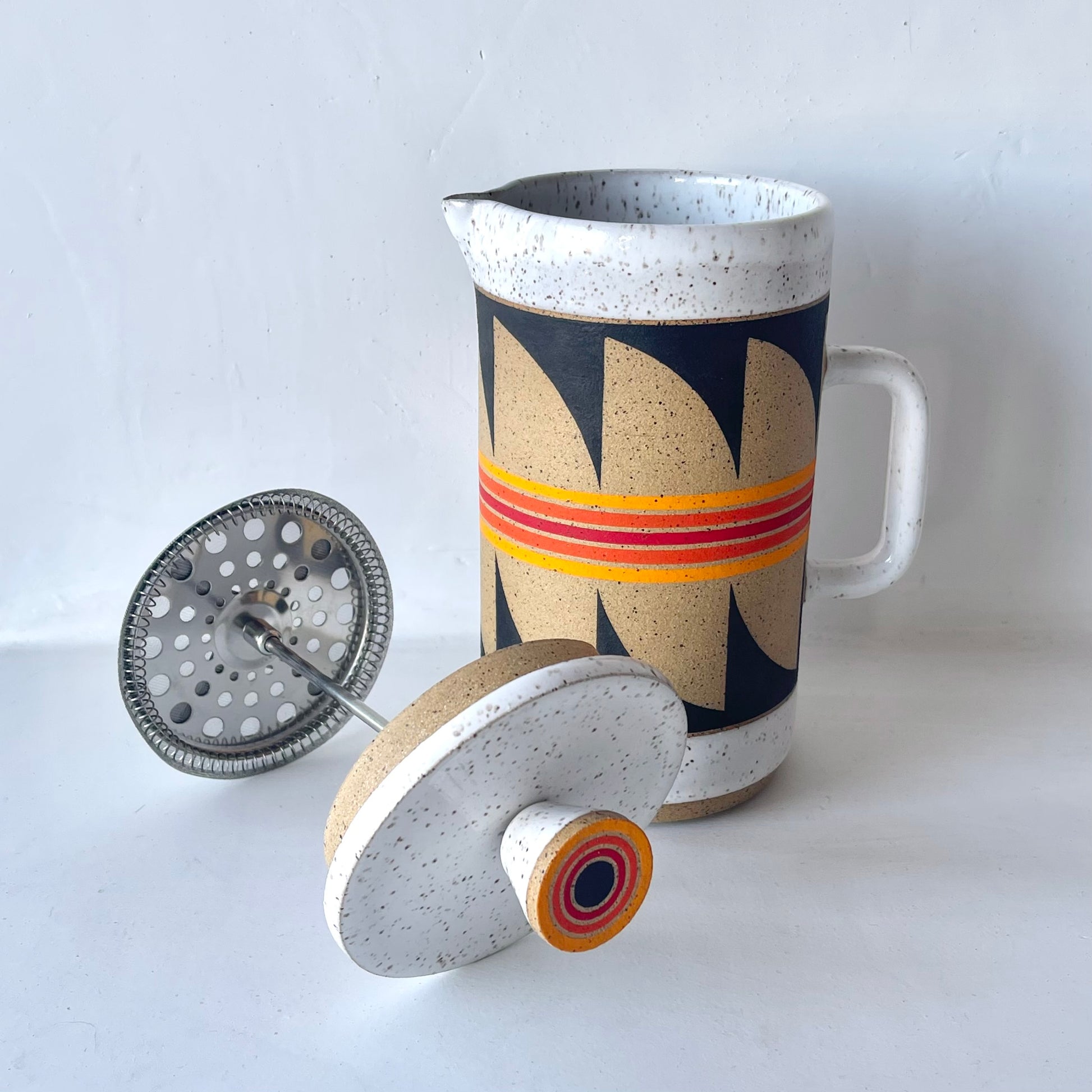 Handmade 34 oz French press in black geometric pattern with orange and red stripes, lined with glossy white
