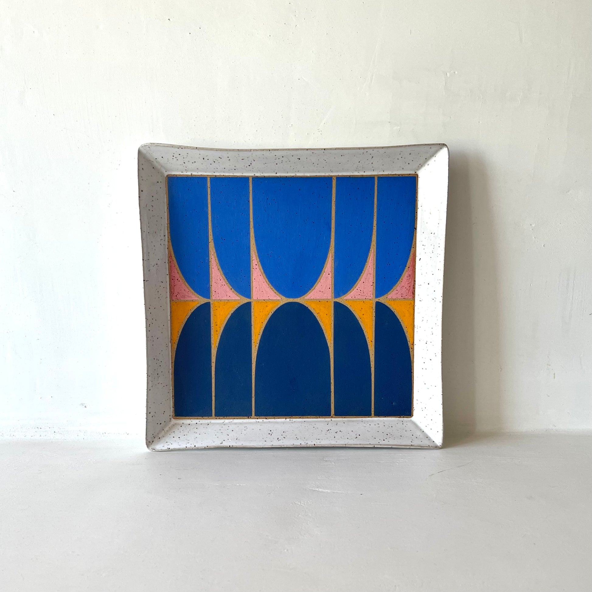 Handmade decorative plate glazed in a blue, pink and orange geometric design and lined with glossy white*