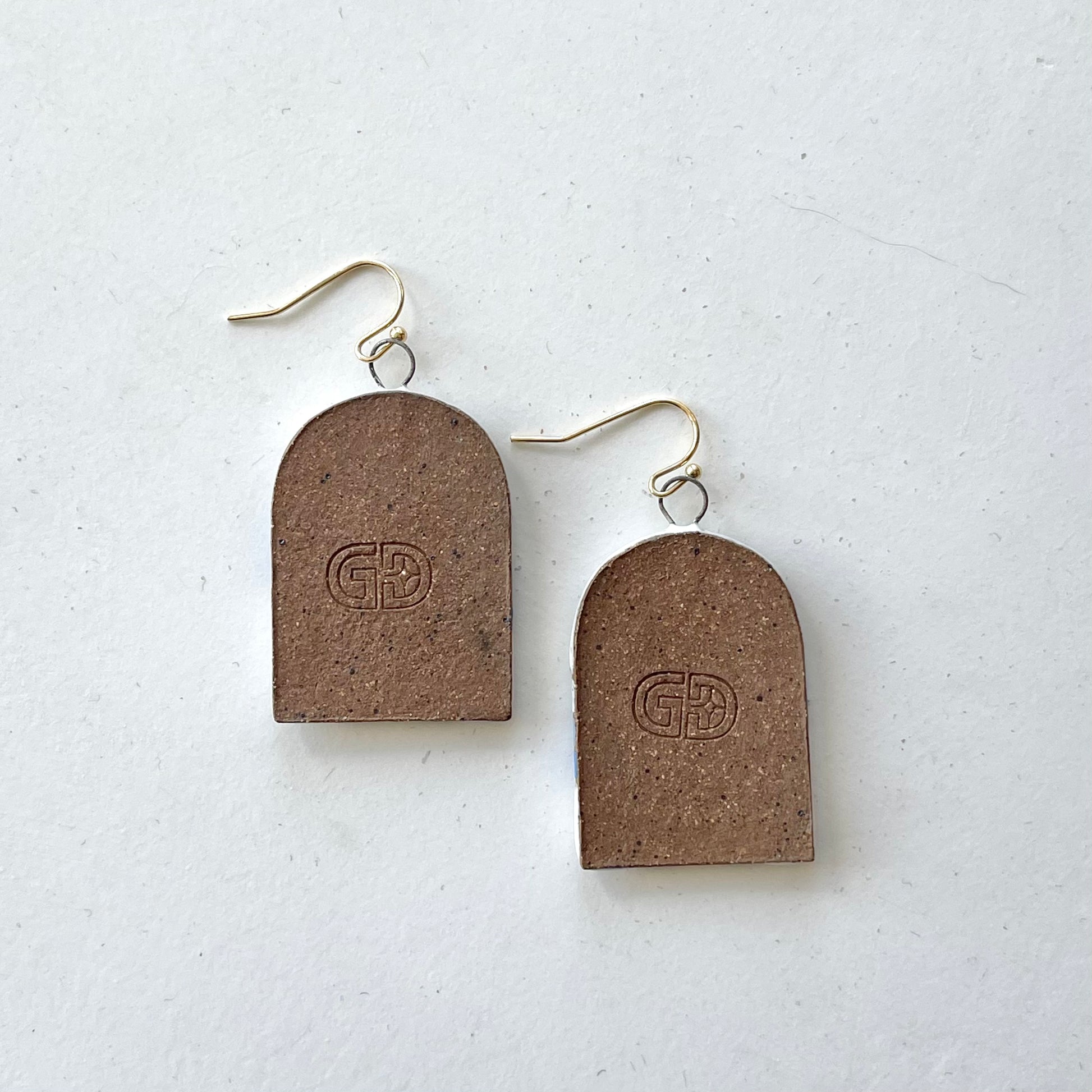 Handmade earrings glazed in a cool blue retro design over glossy white, on a dark brown speckled clay body.