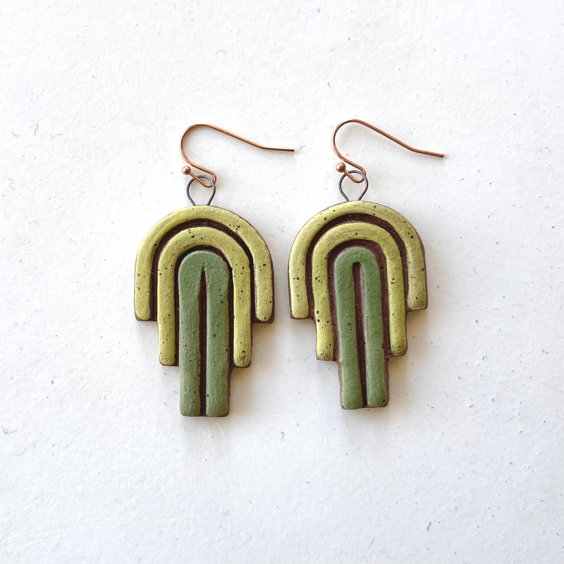 Handmade retro-inspired earrings glazed with earthy greens over a dark speckled brown clay body.