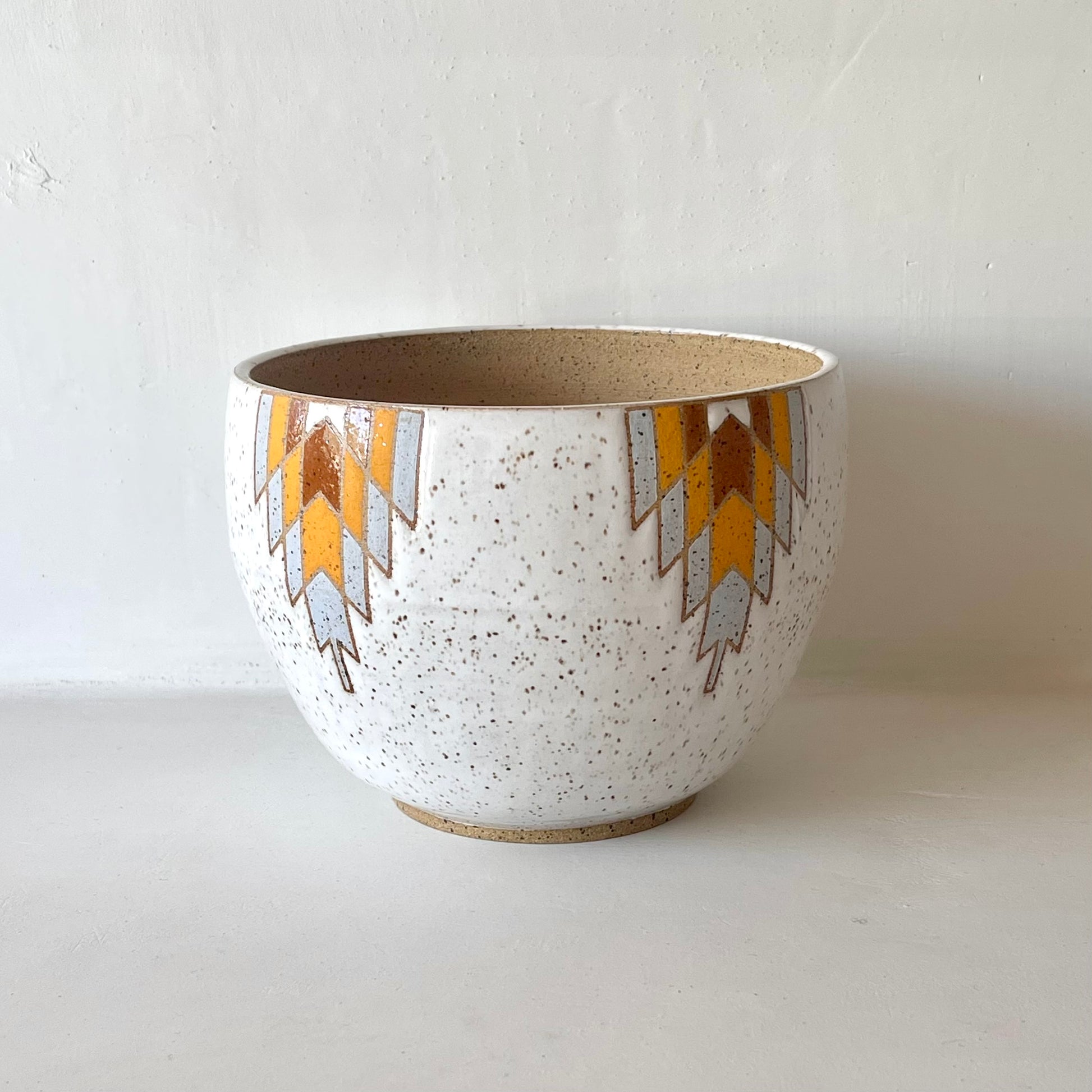 Handmade, lightweight planter glazed in a deco design of saffron, warm brown and baby blue over glossy white