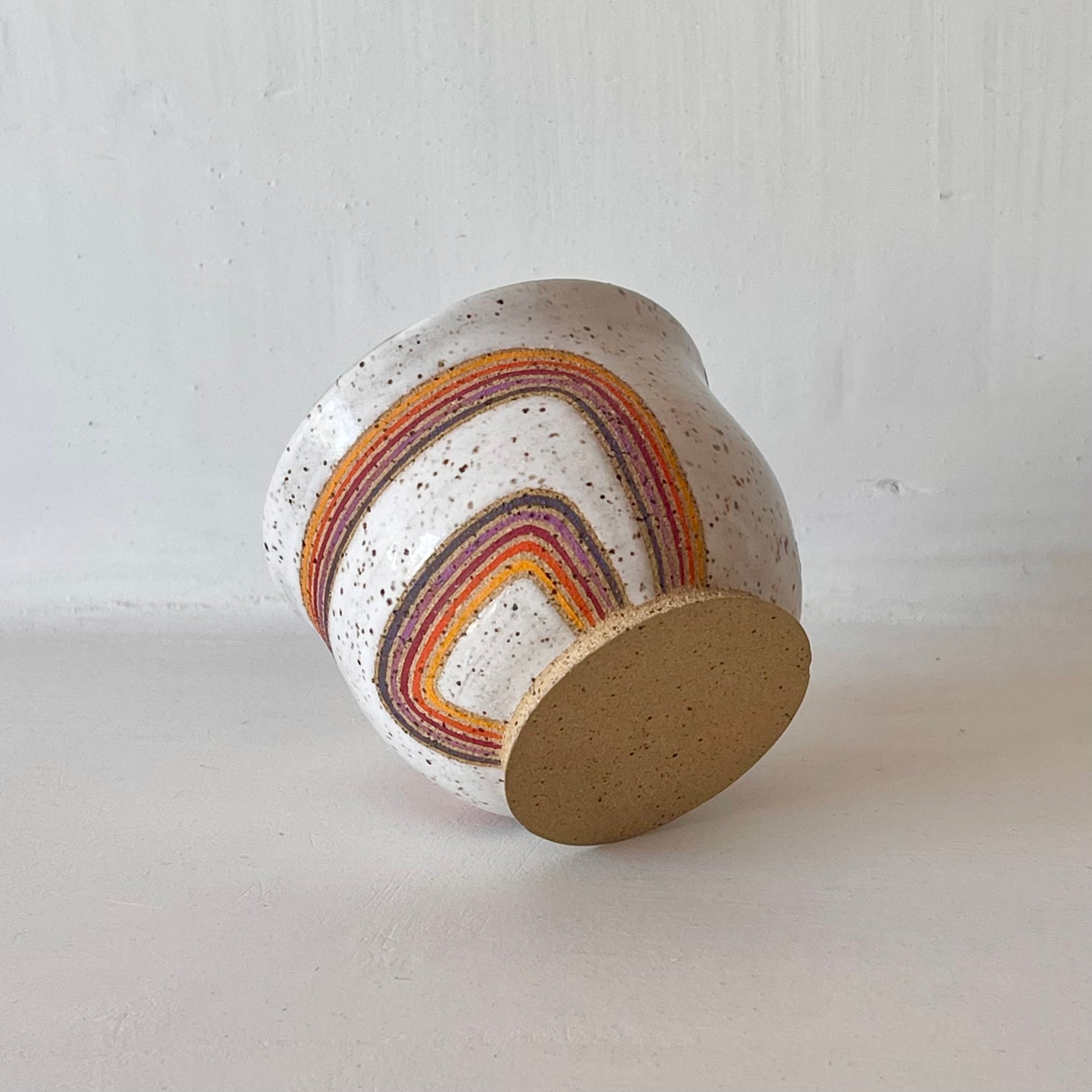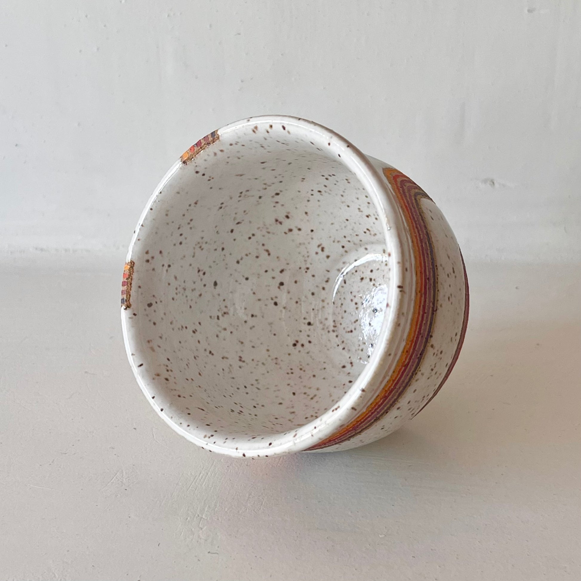 Teeny 6oz teacup glazed with asymmetrical, sunset-colored bands over glossy white*